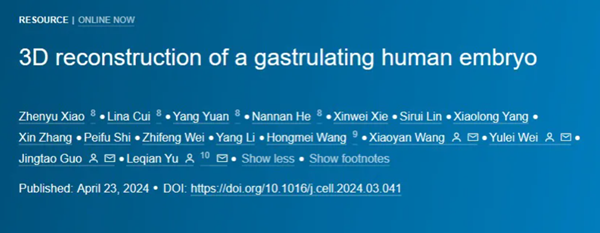 On April 23, Associate Professor Xiao Zhenyu, of the School of Life Science at Beijing Institute of Technology (BIT), alongside researchers Wang Hongmei, Yu Leqian, and Guo Jingtao from the Institute of Zoology (IOZ) at the Chinese Academy of Sciences (CAS), Professor Wei Yulei from China Agricultural University, and Assistant Researcher He Nannan from the First Affiliated Hospital of Zhengzhou University, published an article in the renowned international academic journal Cell, titled "3D Reconstruction of a Gastrulating Human Embryo." Using chip technology and 3D animation reconstruction, they reconstructed a high-resolution 3D digital human gastrula for the first time, filling in the knowledge gap regarding human embryonic development during the gastrula stage. This research provides important information for understanding human early embryonic development and related diseases, laying a scientific foundation for improving adverse pregnancy outcomes.